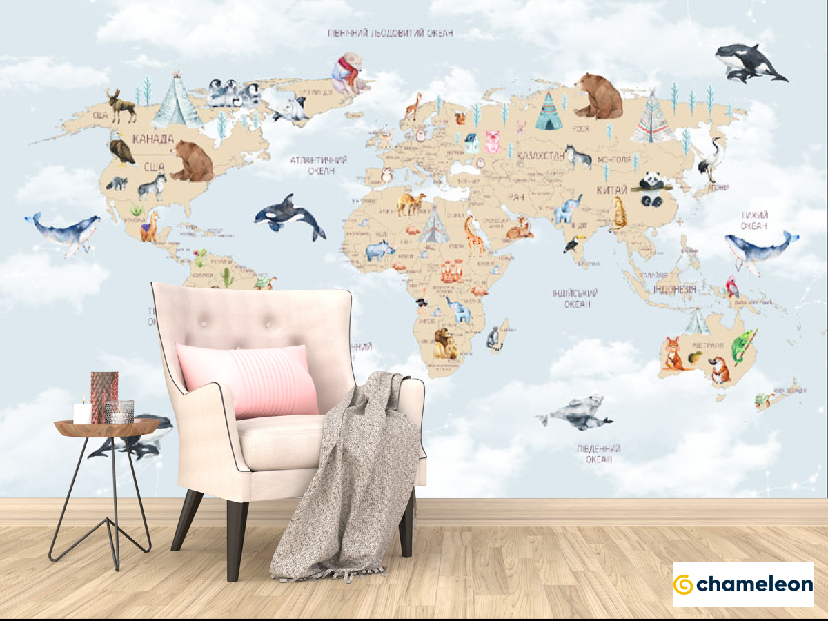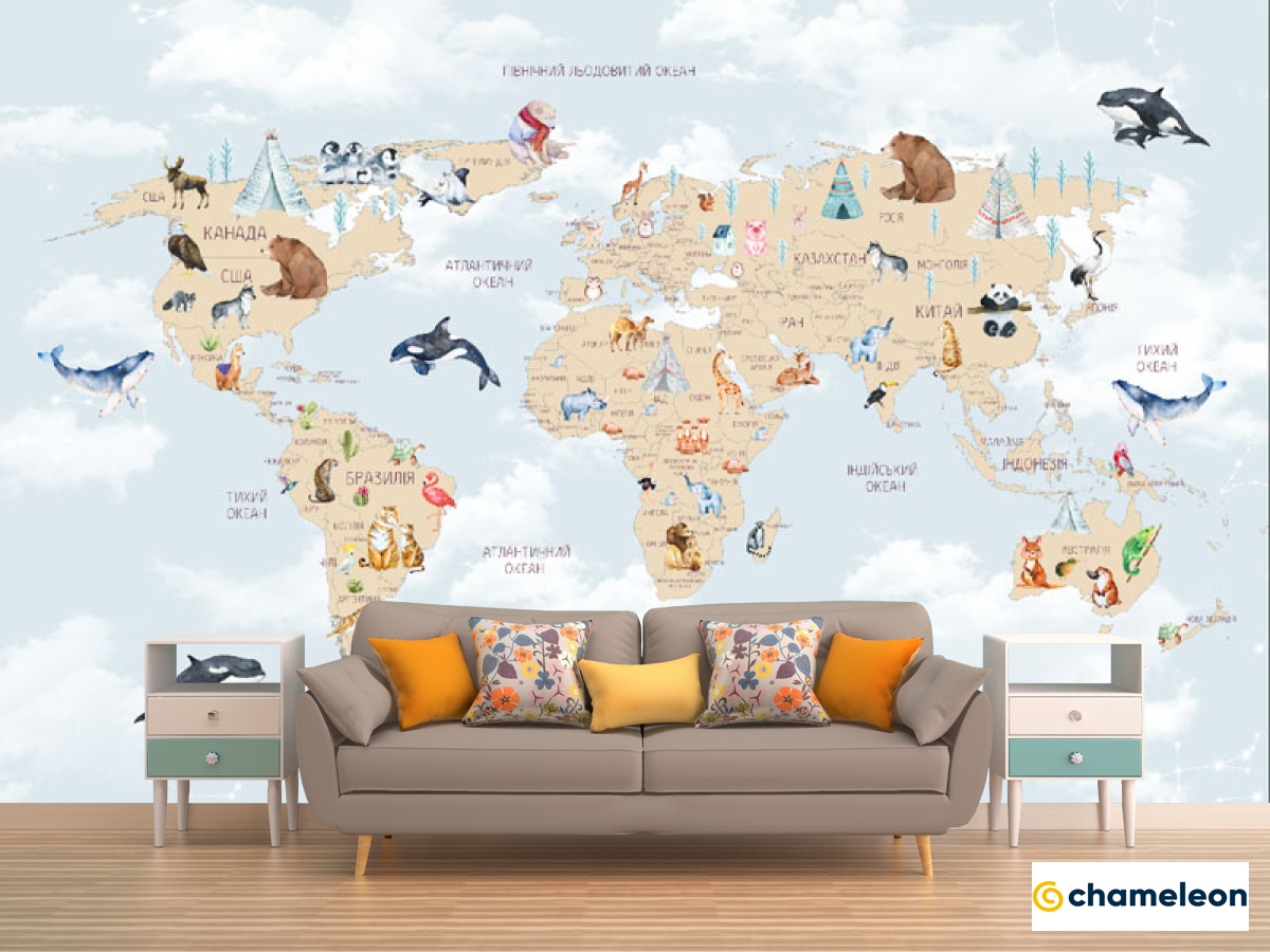 Фотообои «Фотообои Карта детская с облачками на украинском языке в синем цвете.», (арт. 30289_1) - купить в интернет-магазине Хамелеон