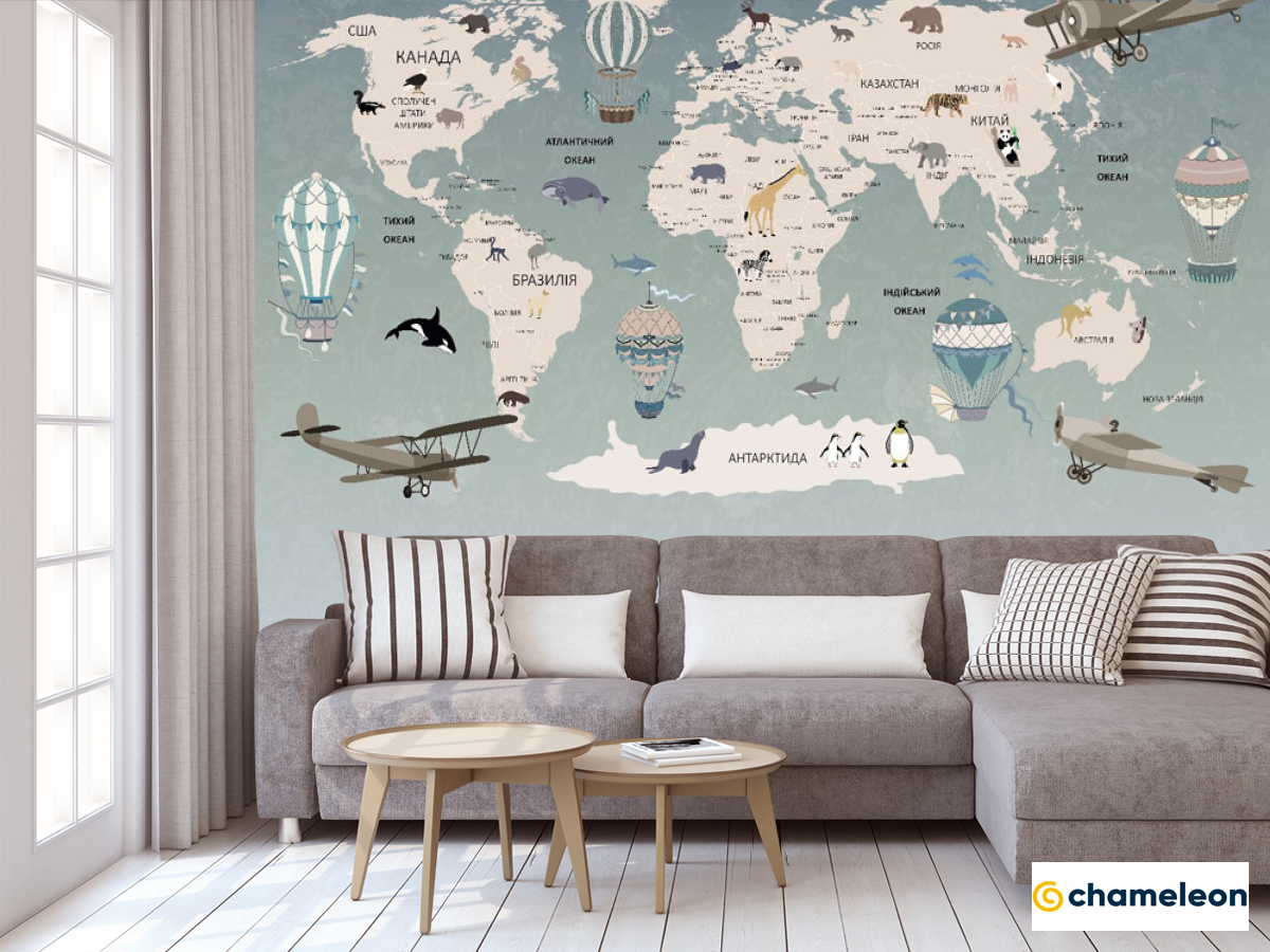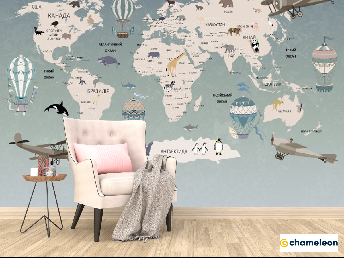 Фотообои «Фотообои Детская карта на украинском с воздушными шарами и самолетами», (арт. 31771) - купить в интернет-магазине Хамелеон