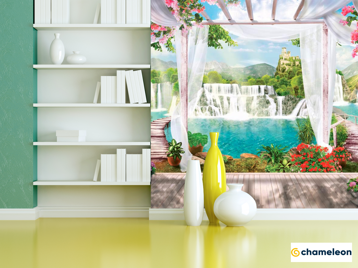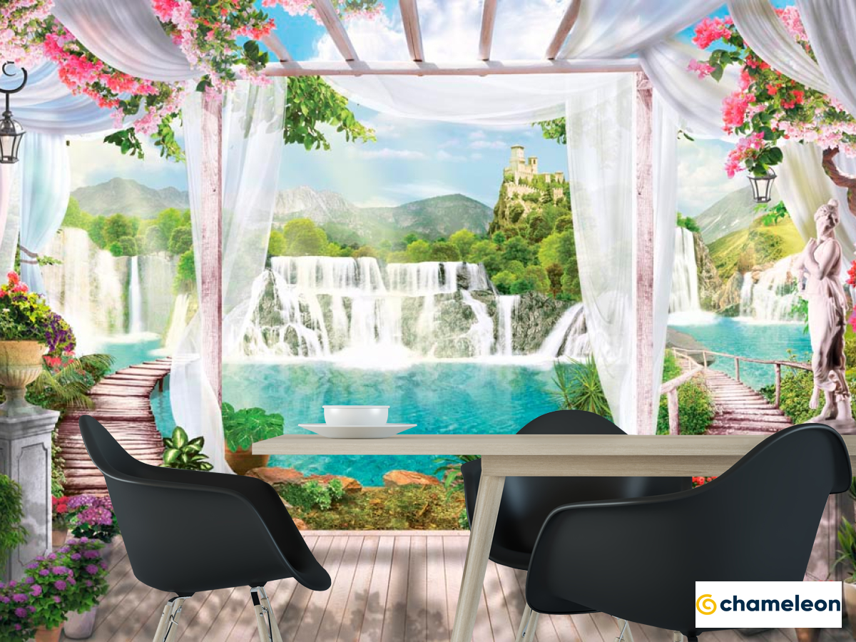 Фотошпалери «Фотошпалери Водоспад, замок, квіти», (арт. 15165) - купити в інтернет-магазині «Будинок Фотошпалер» Хамелеон