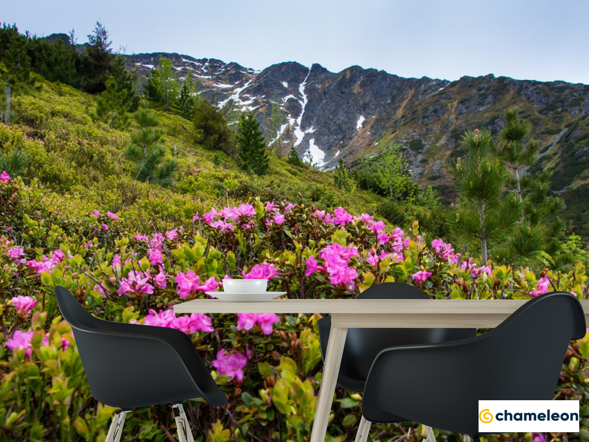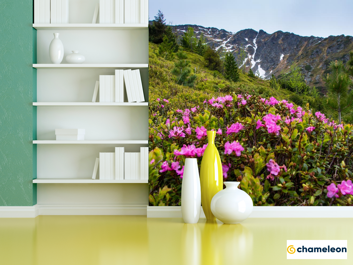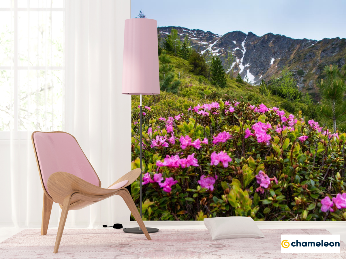 Фотошпалери «Фотошпалери квіти на галявині в горах», (арт. 21449) - купити в інтернет-магазині «Будинок Фотошпалер» Хамелеон