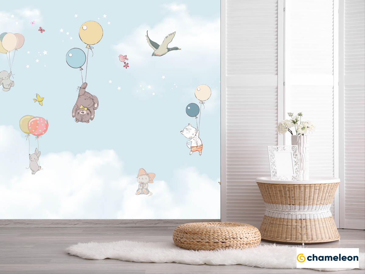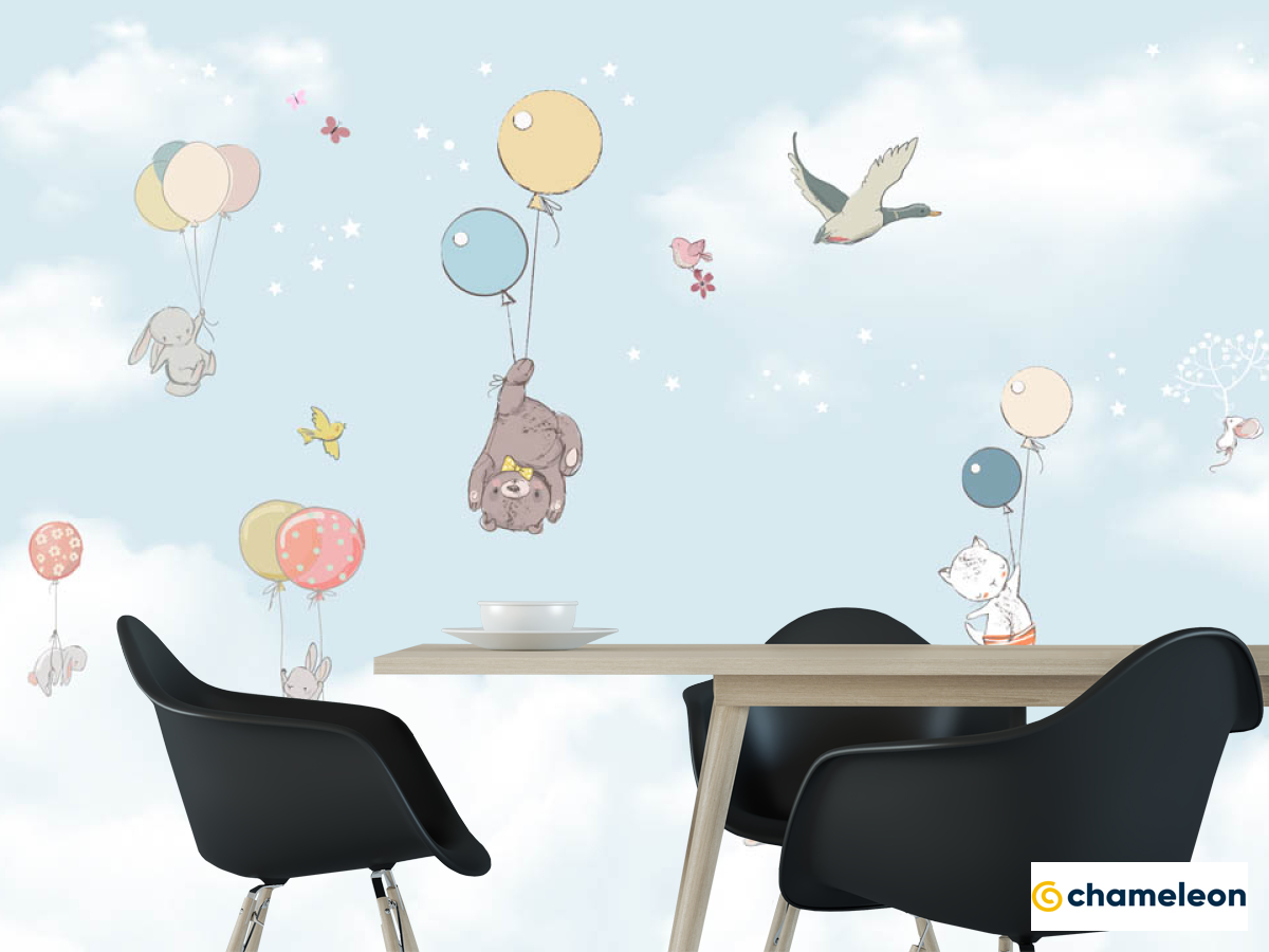 Фотошпалери «Фотошпалери Звірі в небо на повітряних кульках», (арт. 23033) - купити в інтернет-магазині «Будинок Фотошпалер» Хамелеон