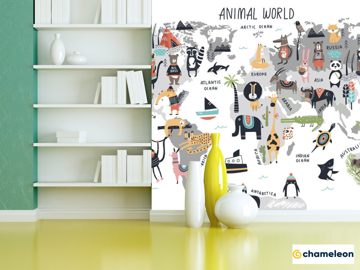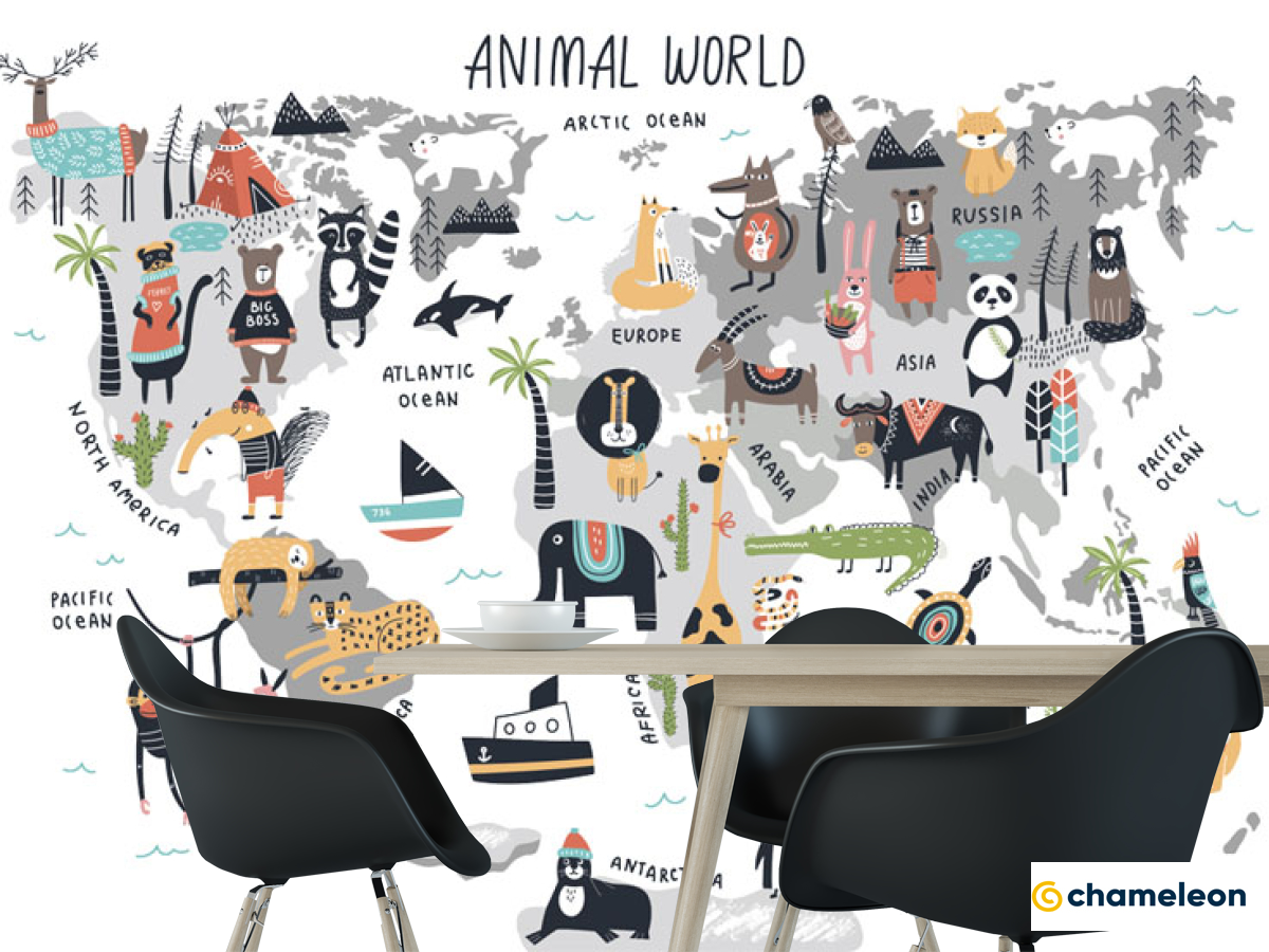 Фотошпалери «Фотошпалери Карта світу з тваринами», (арт. 23074) - купити в інтернет-магазині «Будинок Фотошпалер» Хамелеон