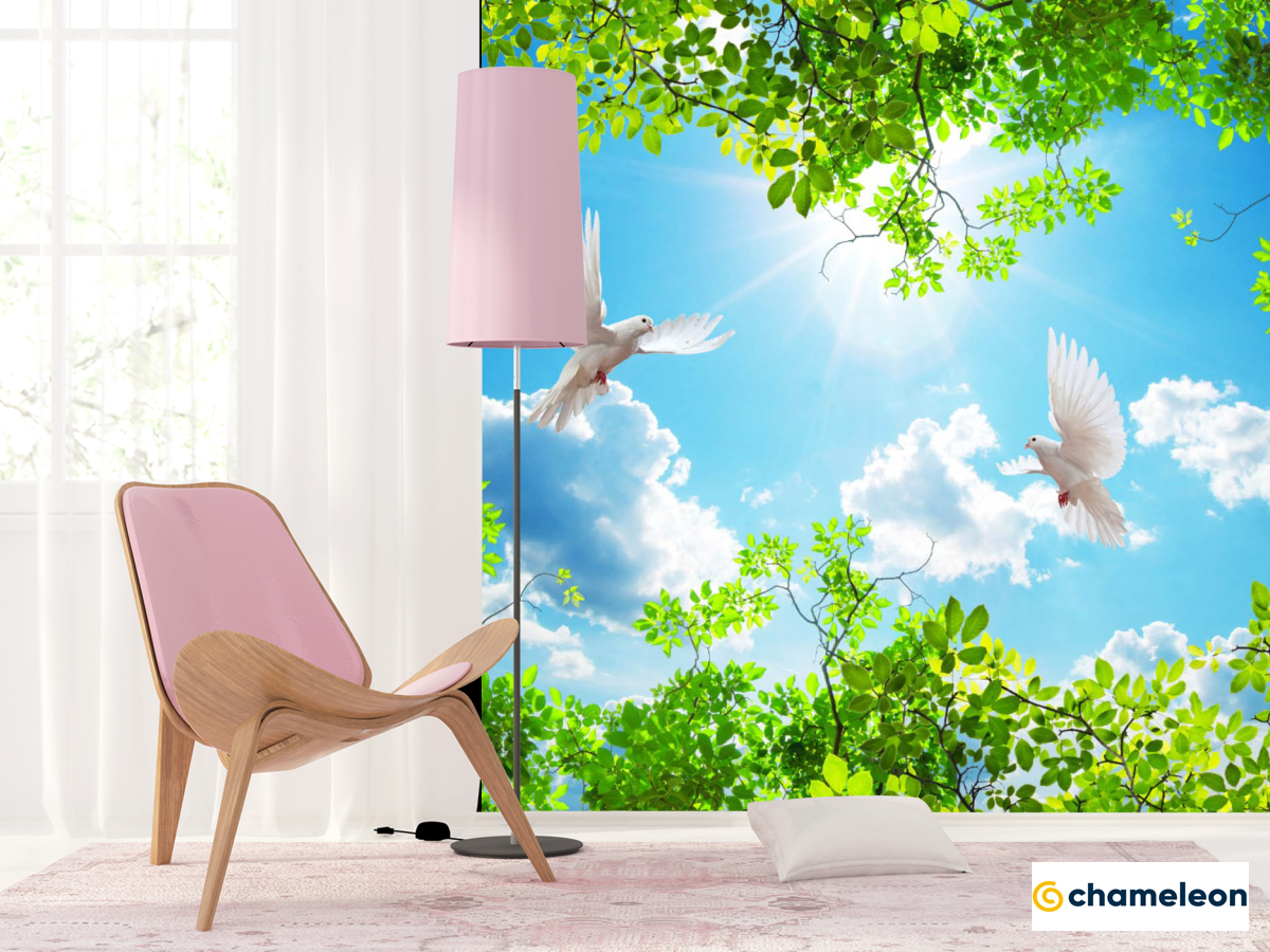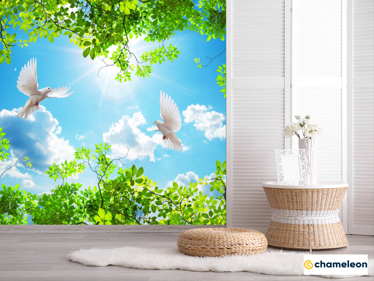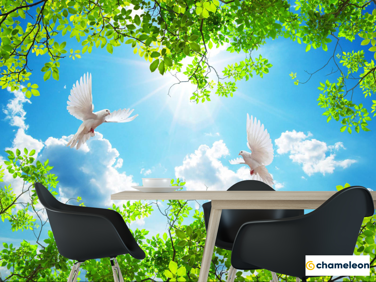 Фотошпалери гілки і голуби для стелі