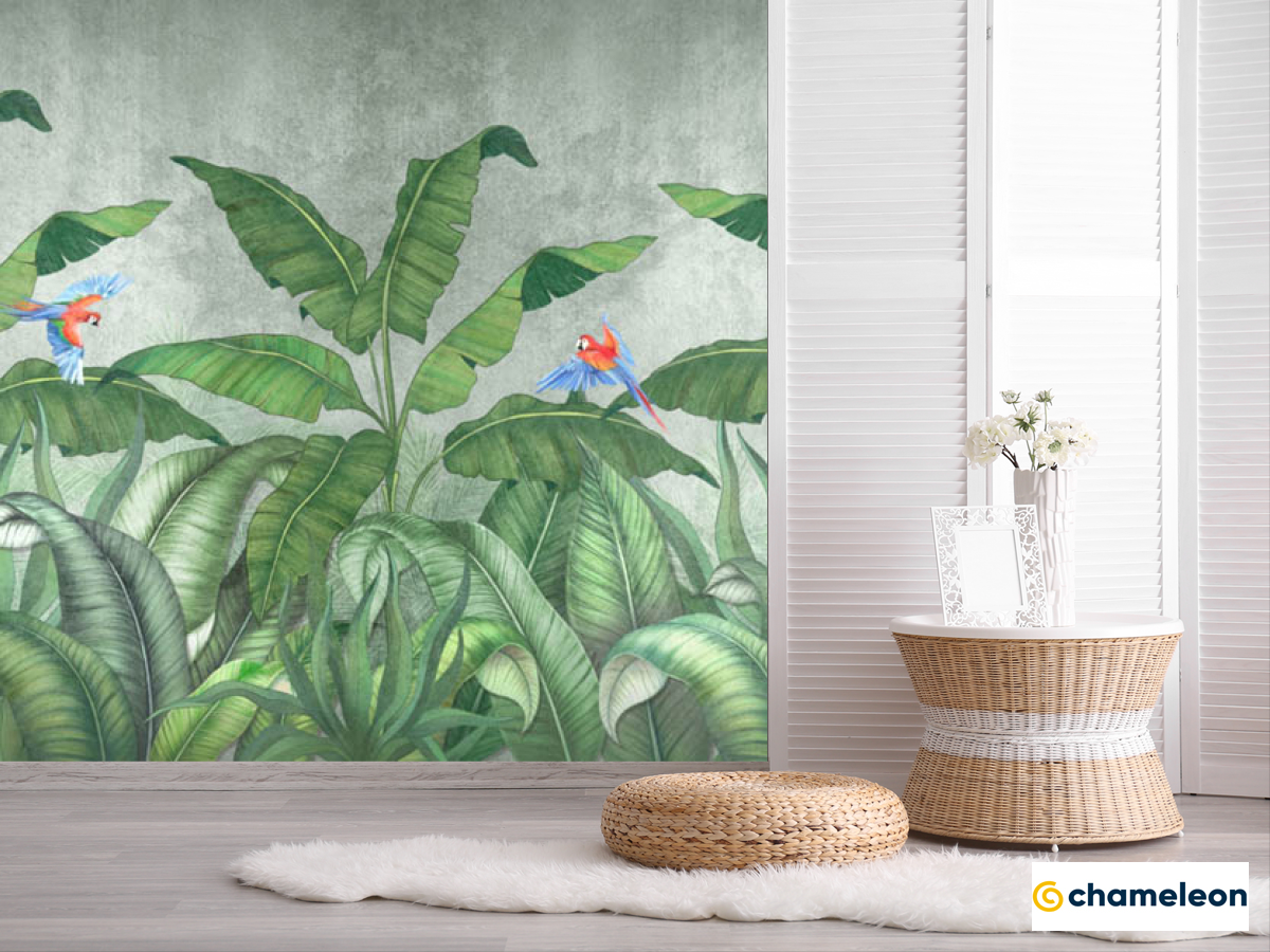 Фотошпалери «Фотошпалери бананове листя з папугами», (арт. 28350) - купити в інтернет-магазині «Будинок Фотошпалер» Хамелеон