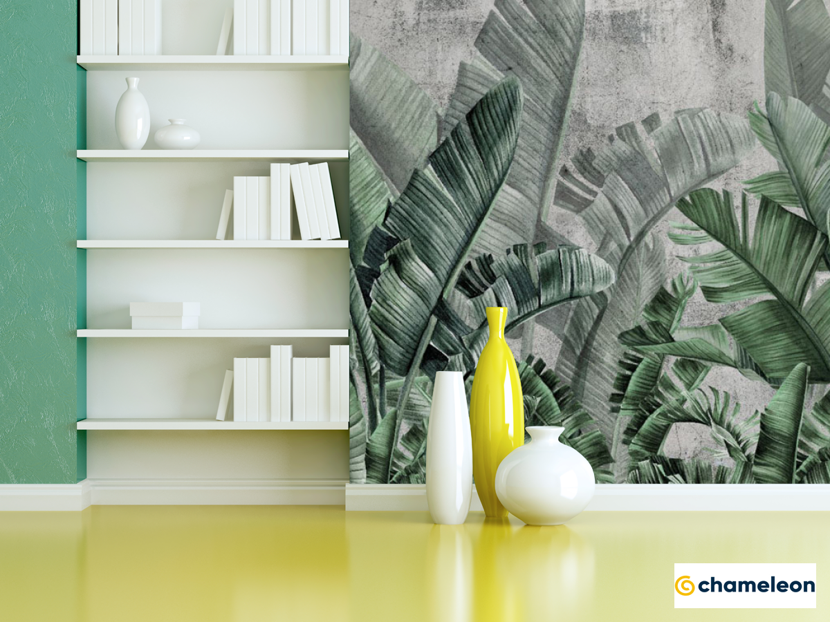 Фотошпалери «Фотошпалери зелені тропічні листя на тлі бетону.», (арт. 33282) - купити в інтернет-магазині «Будинок Фотошпалер» Хамелеон
