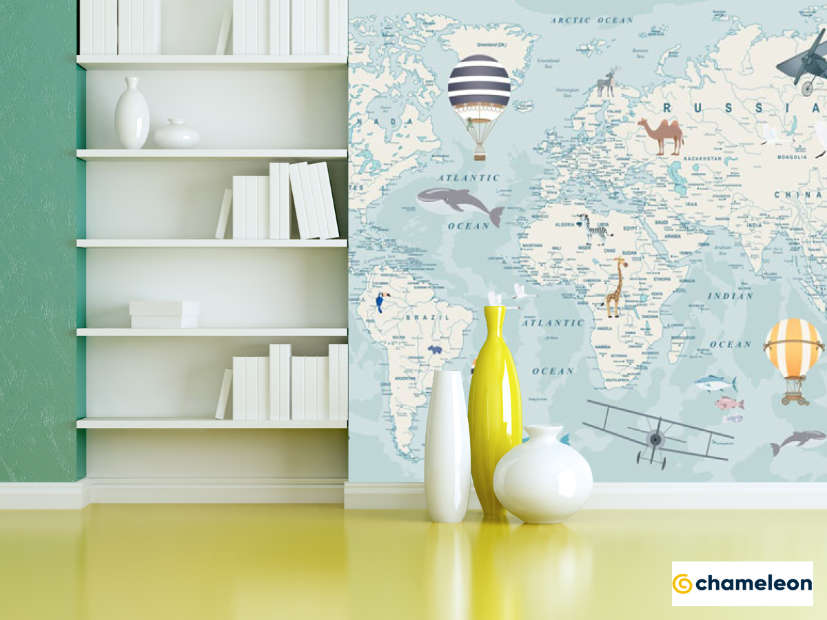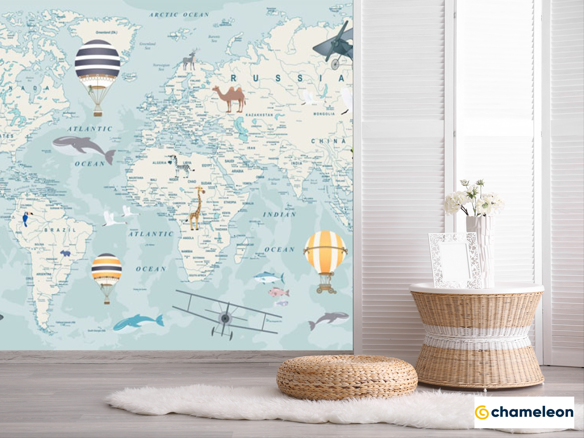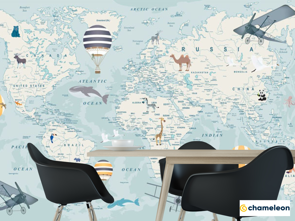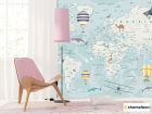 Фотошпалери «Фотошпалери блакитна карта світу з літаками англійською», (арт. 33789) - купити в інтернет-магазині «Будинок Фотошпалер» Хамелеон