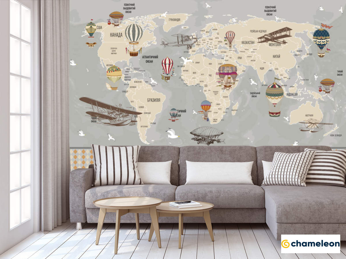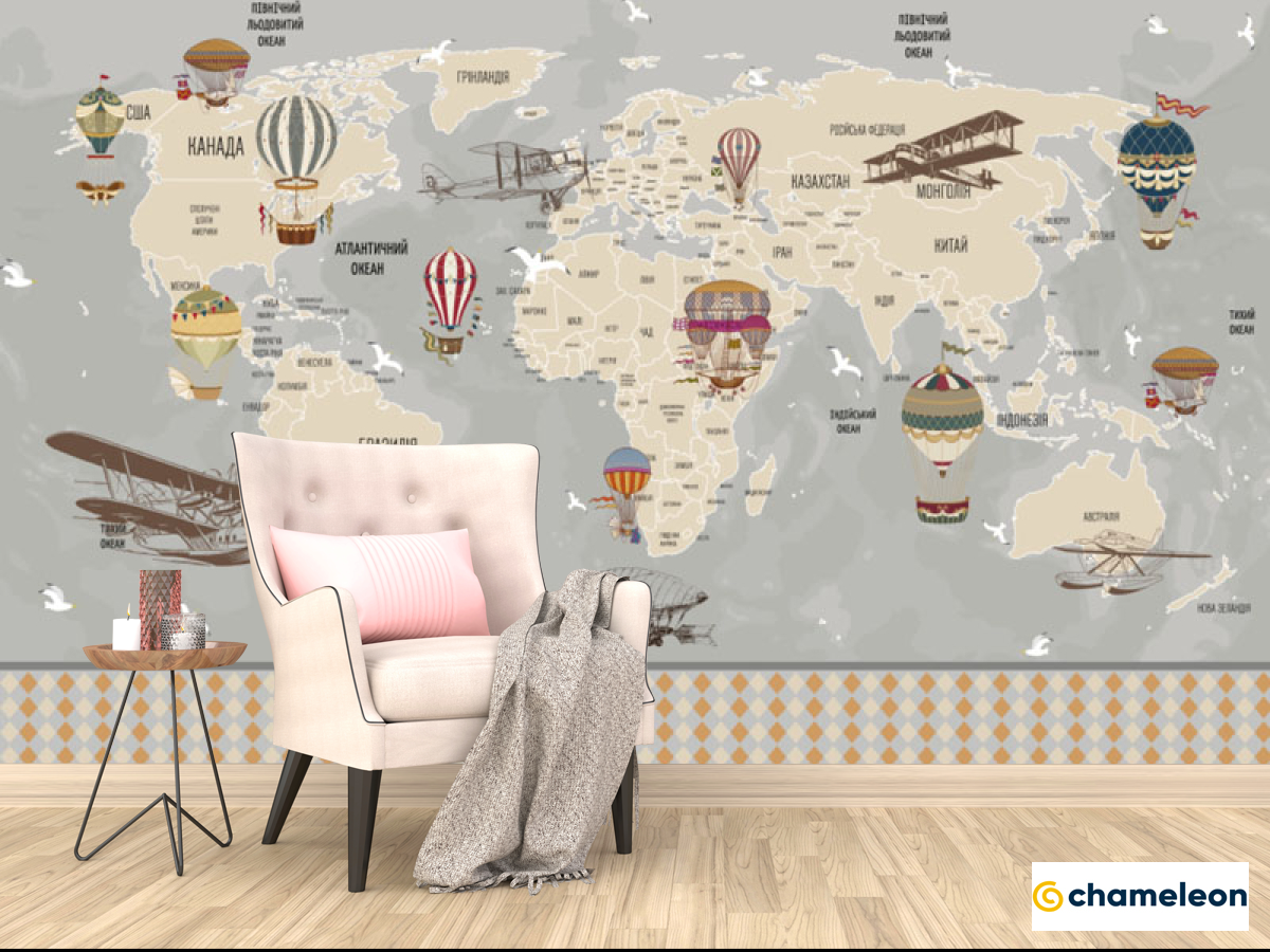 Фотообои «Фотообои Карта детская с самолетами и слоями по русски», (арт. 23024) - купить в интернет-магазине Хамелеон