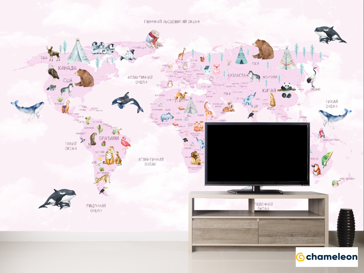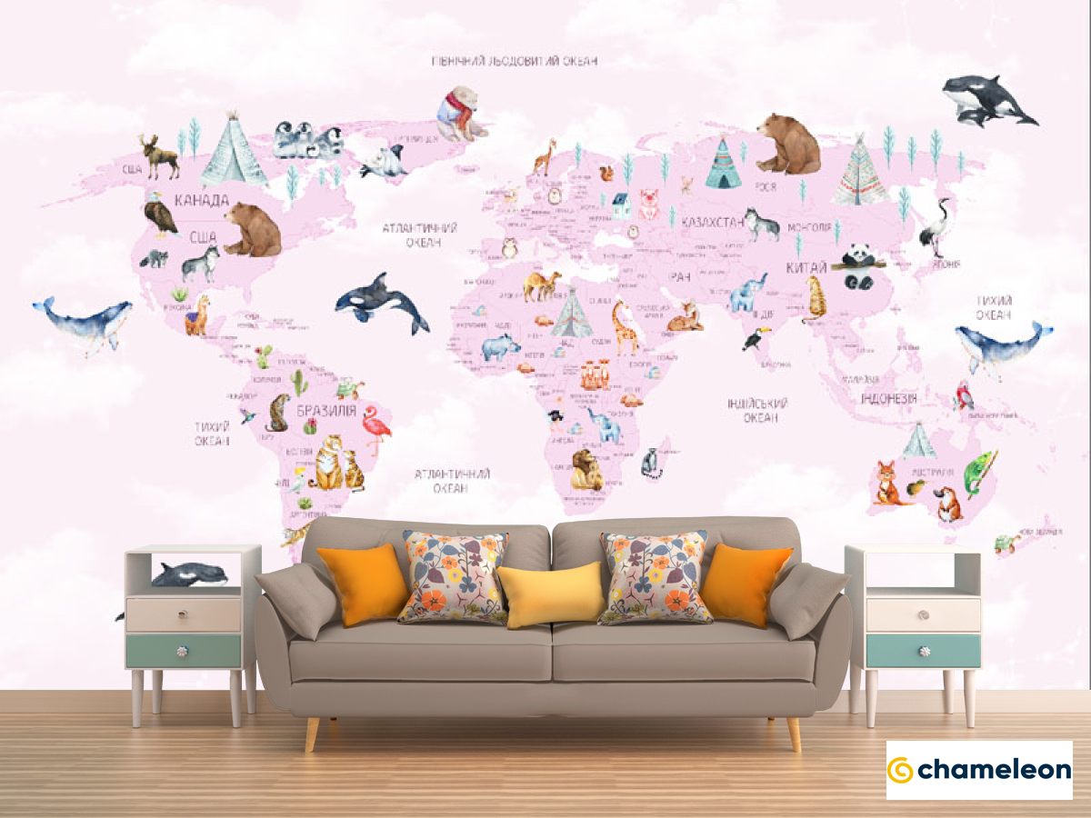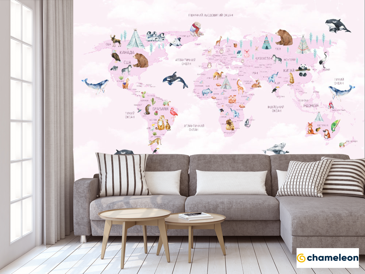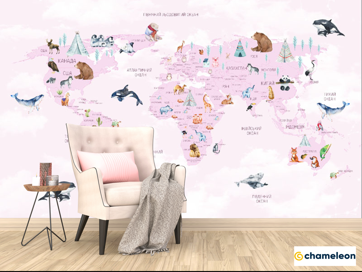 Фотообои «Фотообои Карта детская с облачками на украинском языке в розовом цвете.», (арт. 30289_2) - купить в интернет-магазине Хамелеон