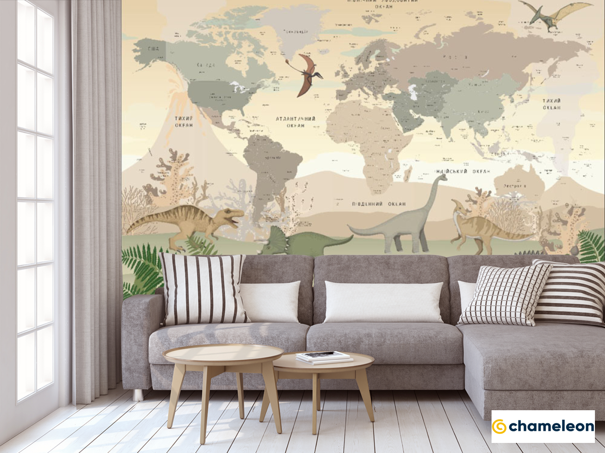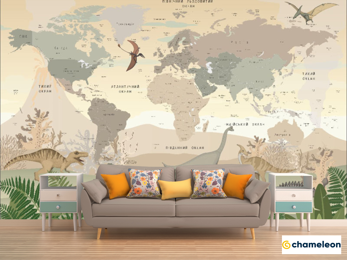 Фотообои «Фотообои Карта детская с динозаврами на украинском», (арт. 31773) - купить в интернет-магазине Хамелеон