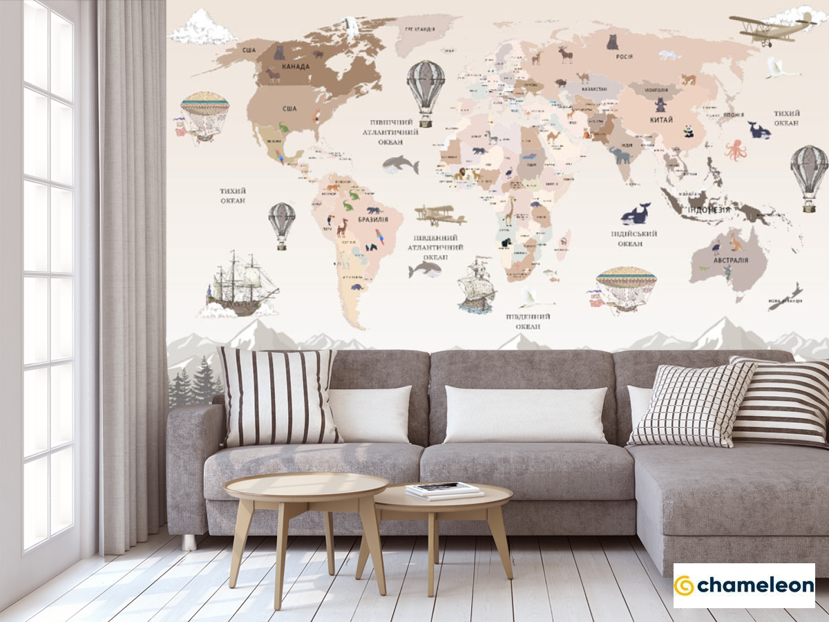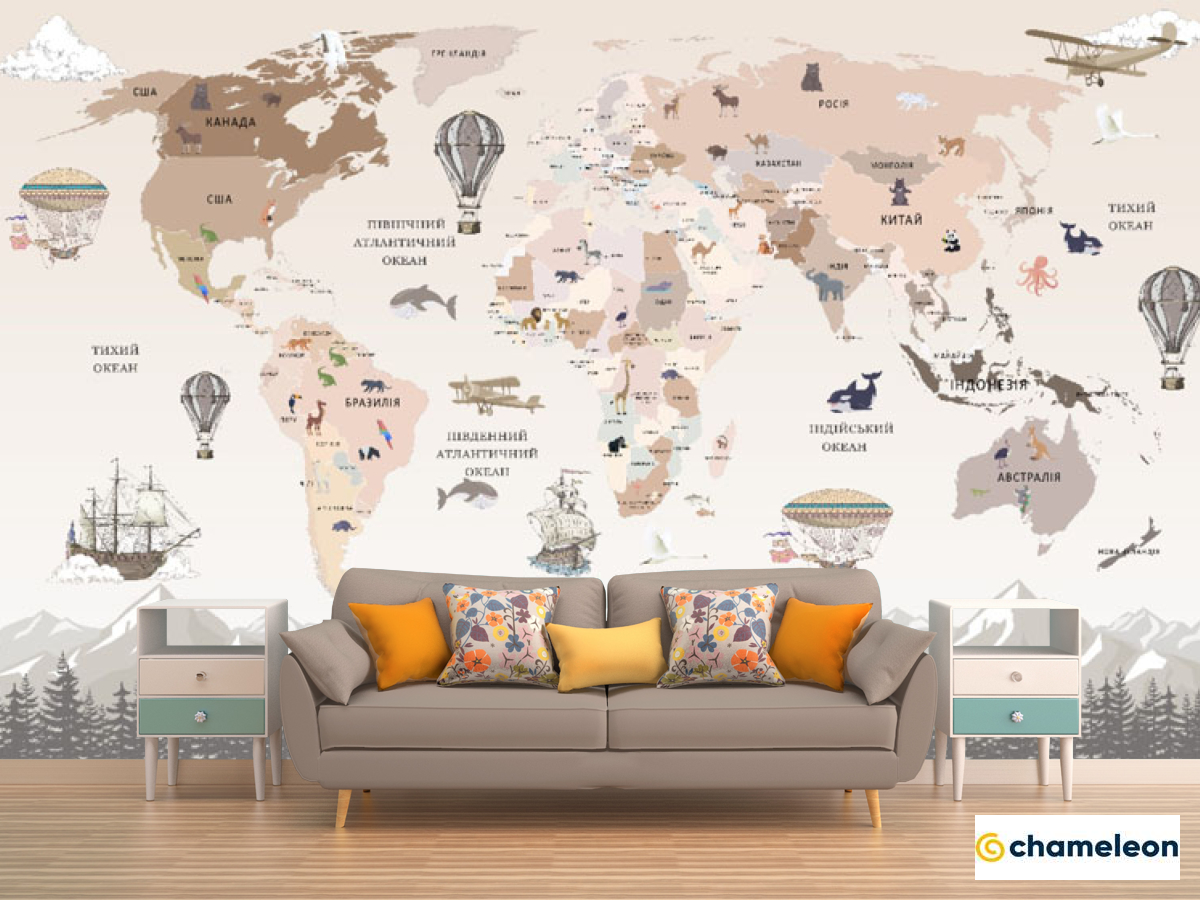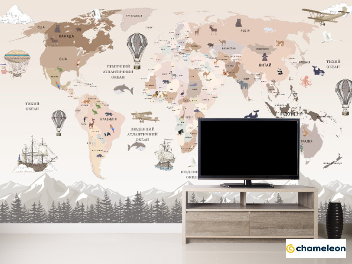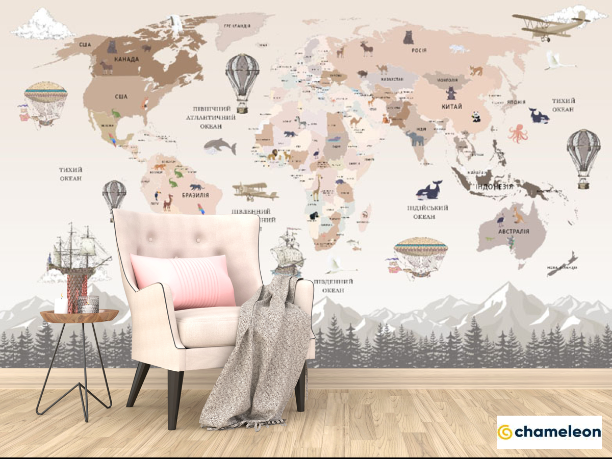 Фотообои «Фотообои Бежевая карта детская с горами и летающими шарами и самолетами», (арт. 31786) - купить в интернет-магазине Хамелеон