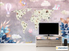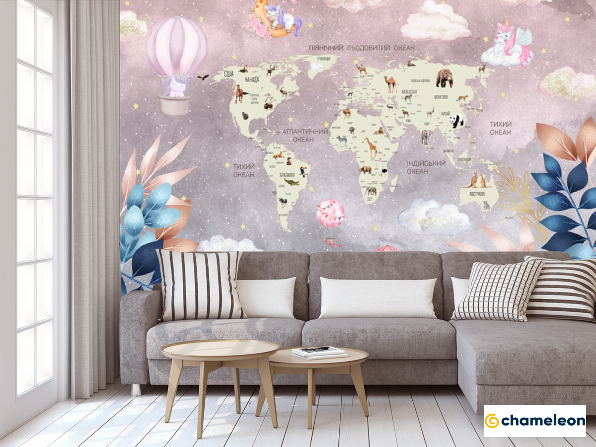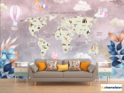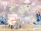 Фотообои Карта розовая в детскую для девочки с синими листьями.