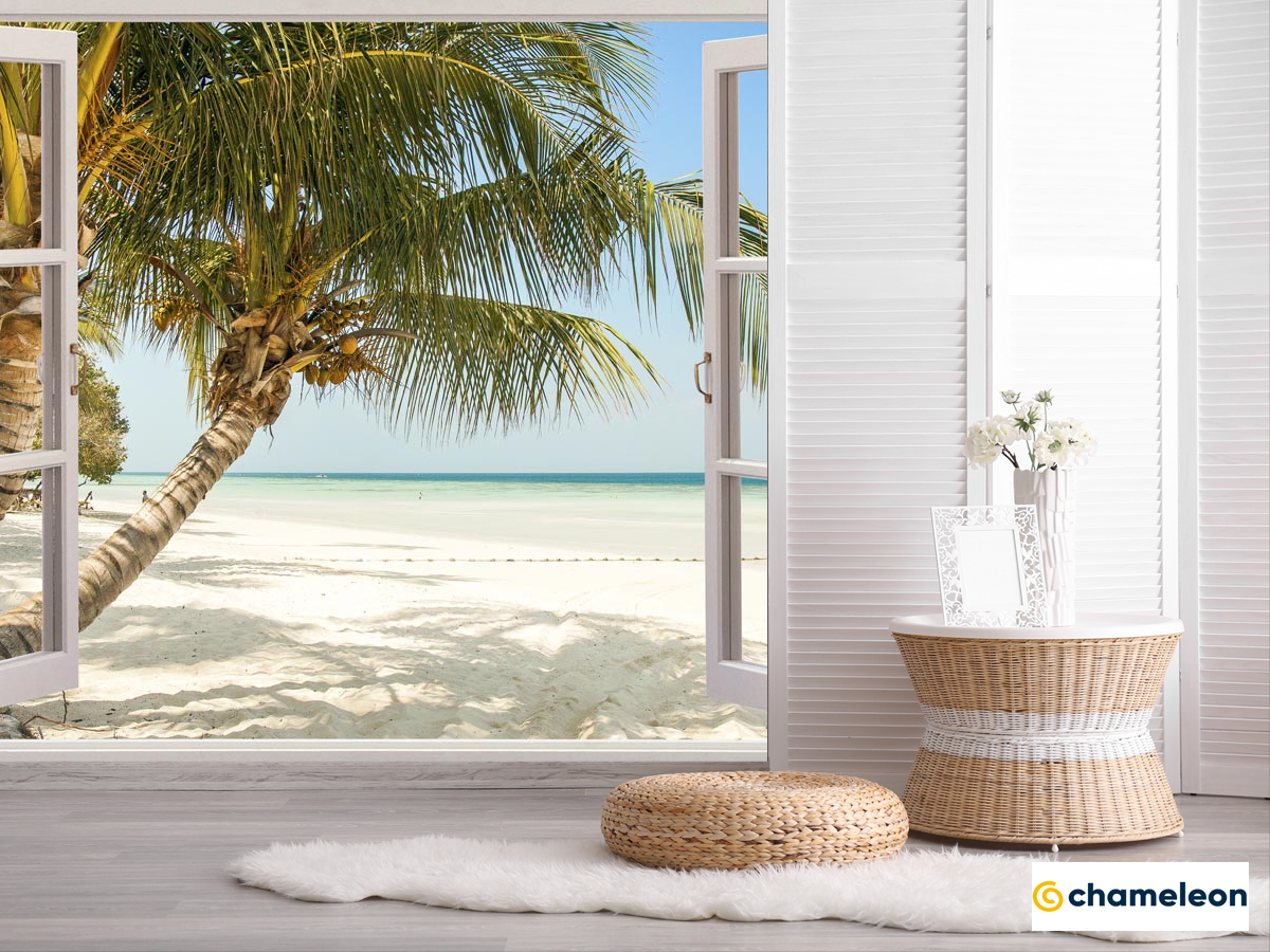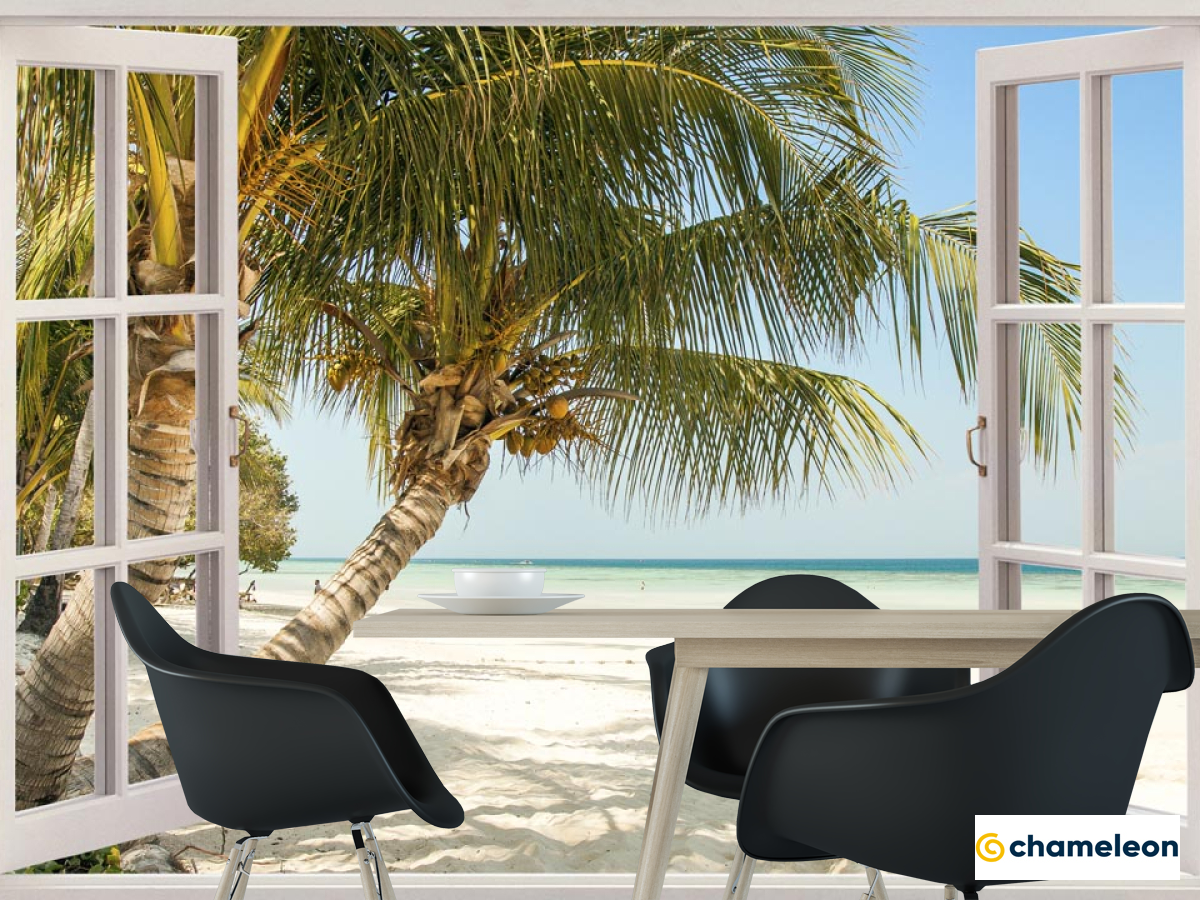 Фотошпалери «Фотошпалери Пальма і море у вікні», (арт. 21434) - купити в інтернет-магазині «Будинок Фотошпалер» Хамелеон