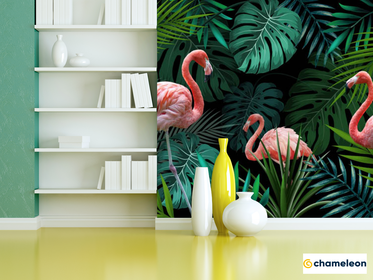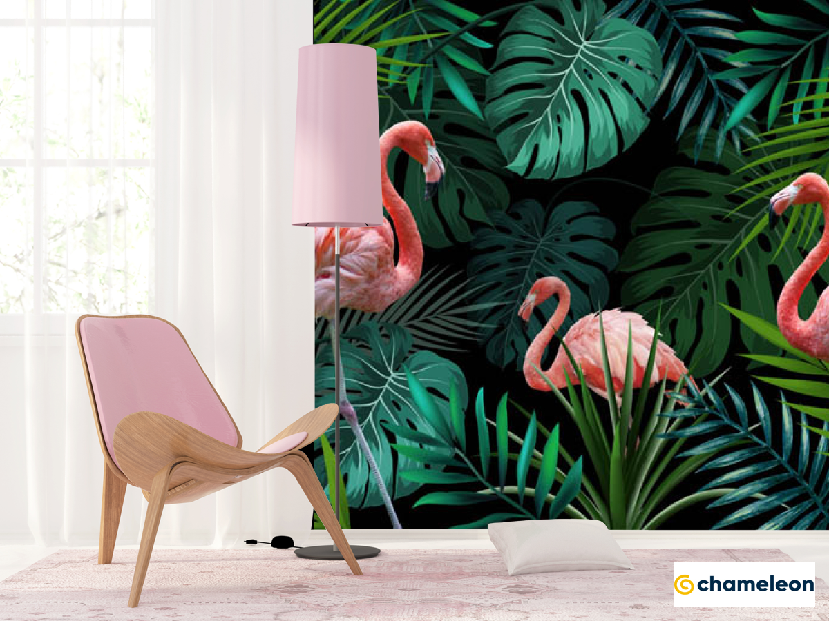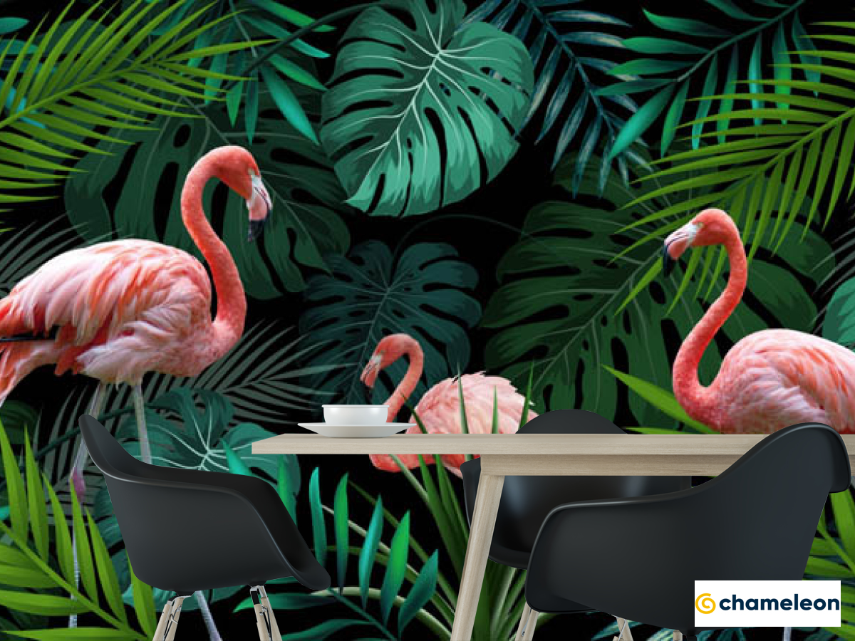 Фотошпалери «Фотошпалери фламінго на тропічних листках», (арт. 28756) - купити в інтернет-магазині «Будинок Фотошпалер» Хамелеон