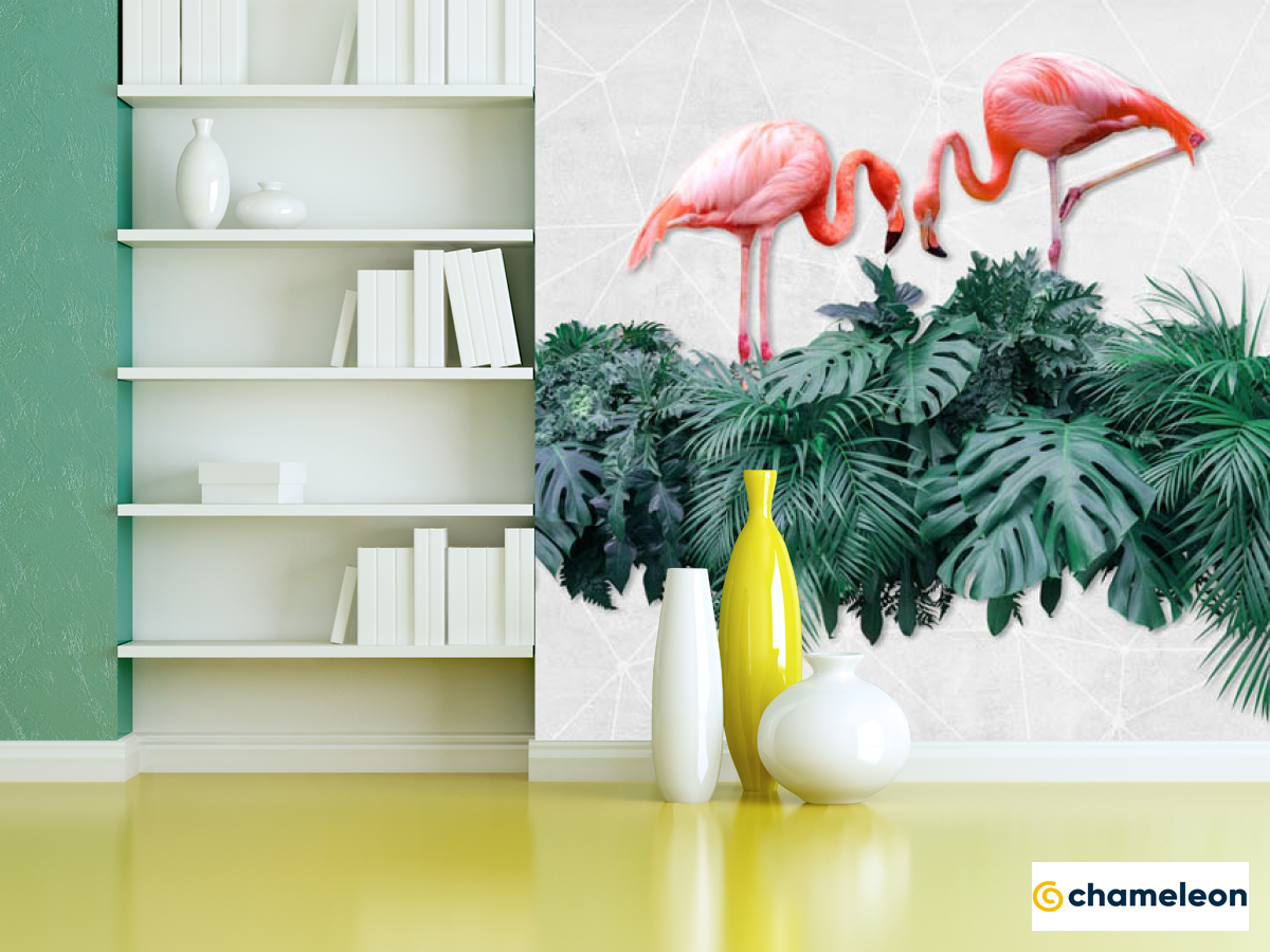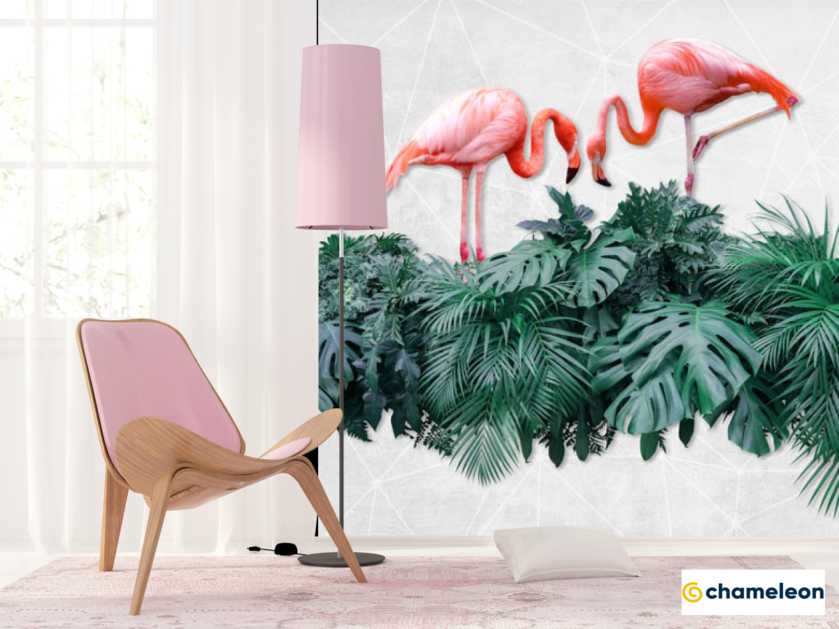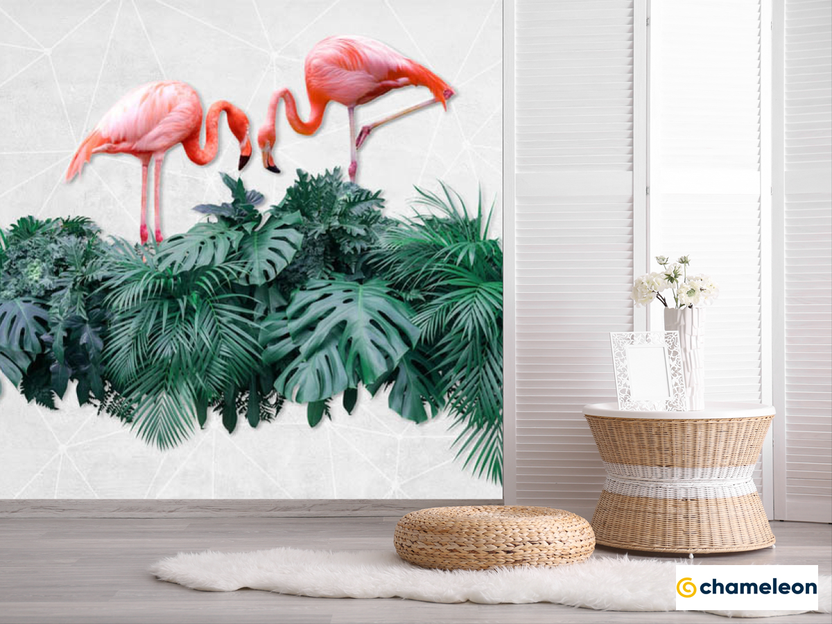 Фотошпалери «Фотошпалери фламінго на тропічних листках», (арт. 29269) - купити в інтернет-магазині «Будинок Фотошпалер» Хамелеон