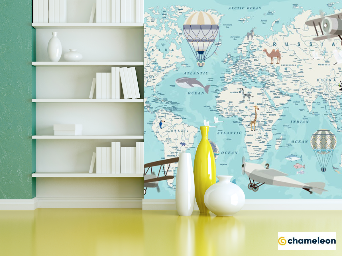 Фотошпалери «Фотошпалери Бірюзова карта дитячий Англійська з літаками», (арт. 31390) - купити в інтернет-магазині «Будинок Фотошпалер» Хамелеон